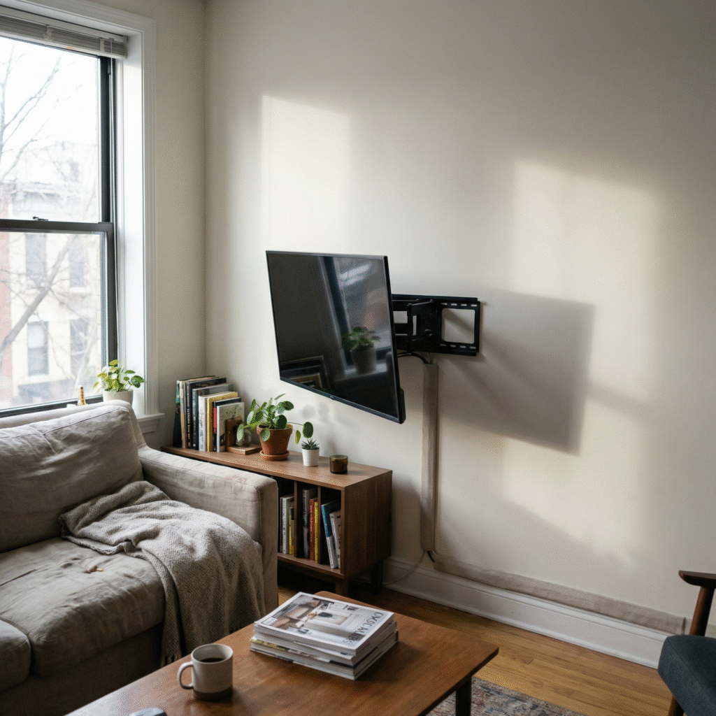 Full-motion TV mount installed cleanly with safe anchoring and hidden cables. Designed for flexibility without sacrificing a professional look.